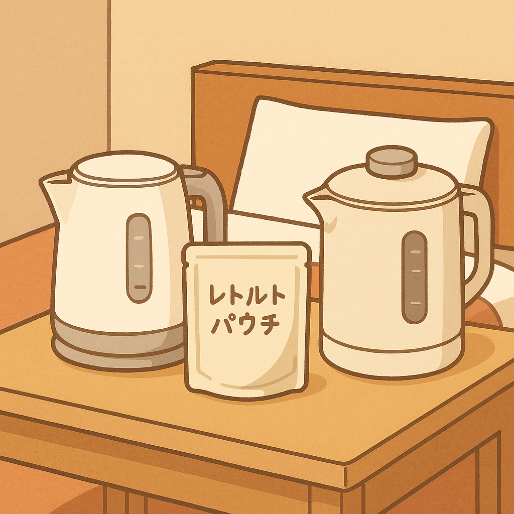 ホテルの客室に備え付けの電気ケトルやお湯ポットを活用し、インスタントスープやレトルト食品を湯煎で温めます。沸騰したお湯にレトルトパウチを入れて5〜10分放置すれば中身がしっかり温まります。